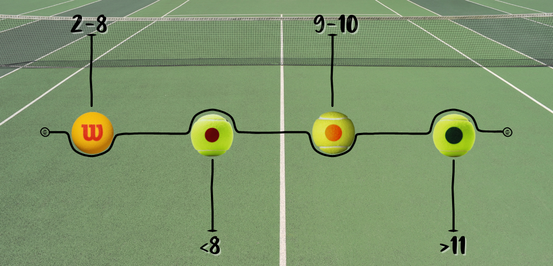 Children are constantly growing, needing greater adaptation when it comes to the balls they play with. There are then 4 stages, namely the foam ball, the red ball, the orange ball and the green ball, then progressing to the adult balls.
