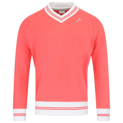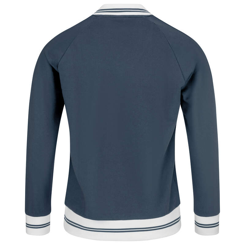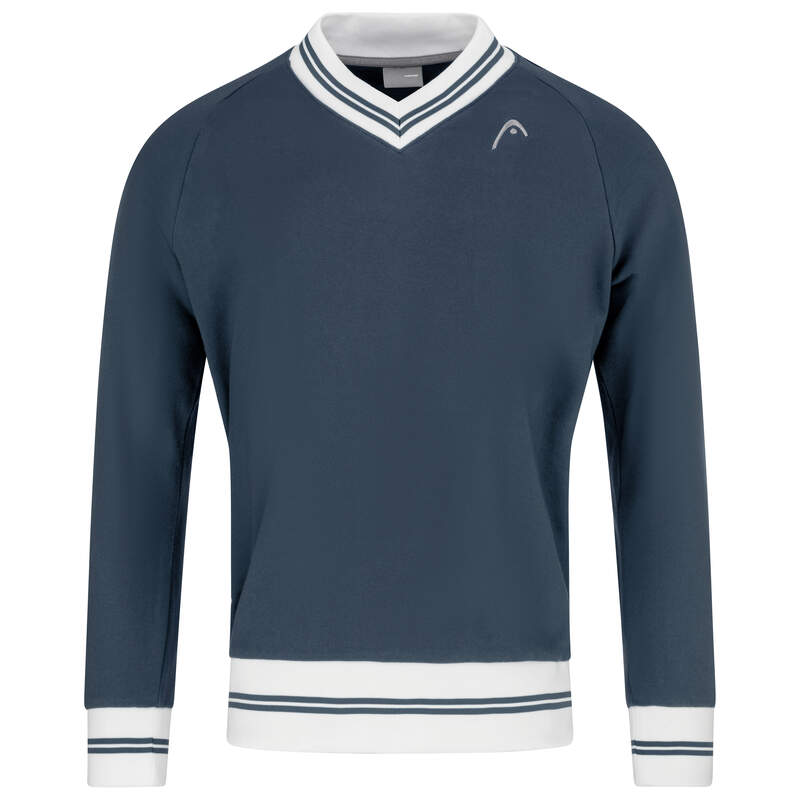 A sweatshirt masculina de inspiração retrô apresenta listras contrastantes na gola canelada com decote em V, além de punhos canelados na parte inferior e na barra das mangas.