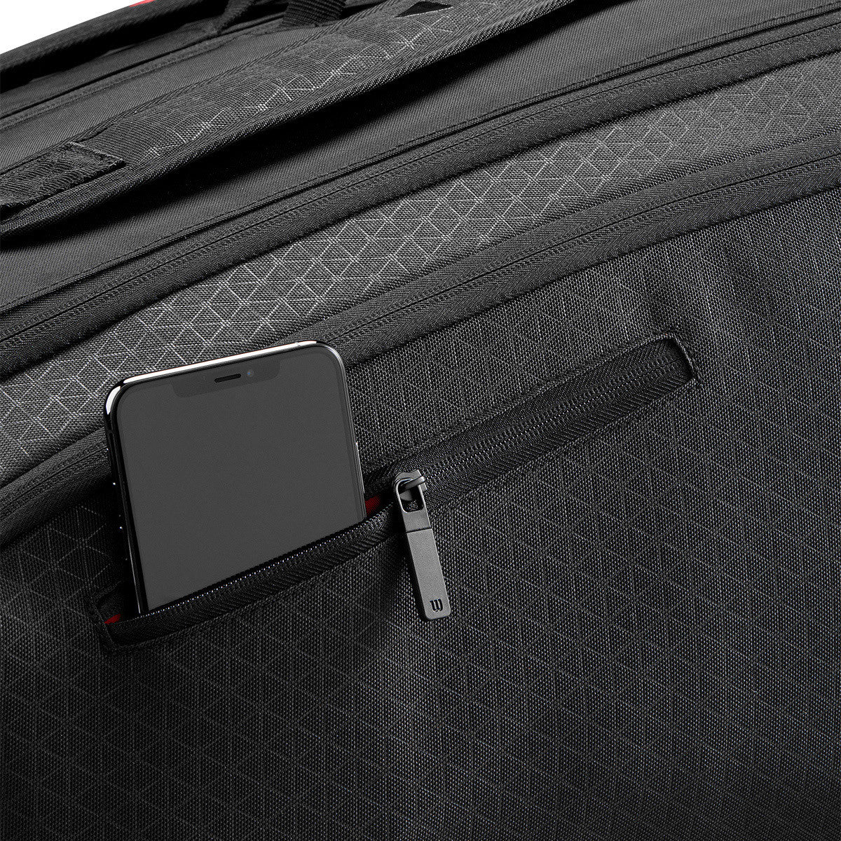 O saco de ténis Wilson Clash 15PK possui três compartimentos, dois dos quais com isolamento térmico, e pode acomodar até 15 raquetes.